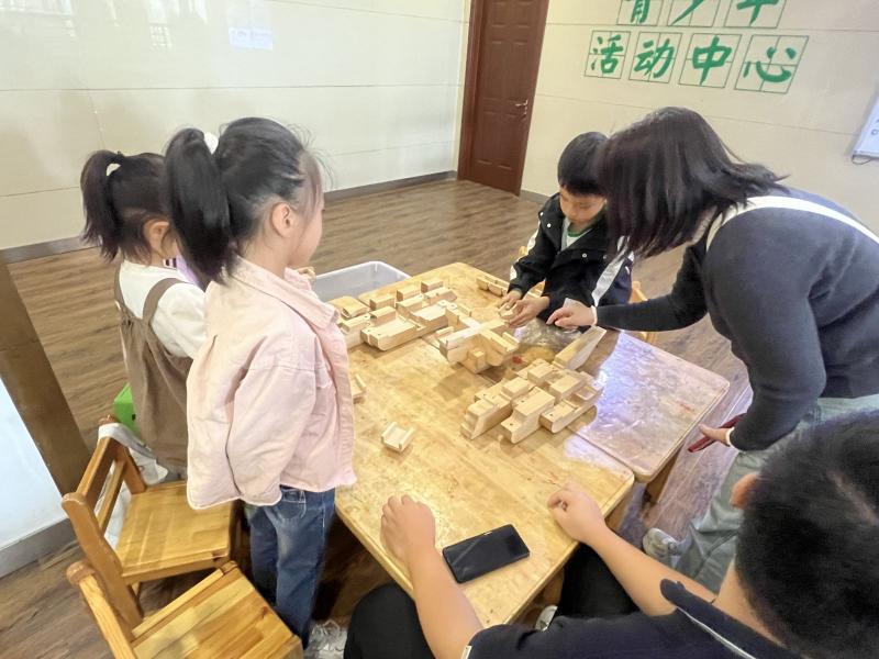 动手环节中,孩子们在老师的指导下认真拼接木构件。起初大家略显困惑,但通过协作探讨,最终成功组装出完整的斗拱模型。当最后一块构件严丝合缝嵌入时,孩子们脸上绽放出自豪的笑容。