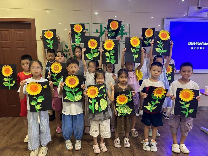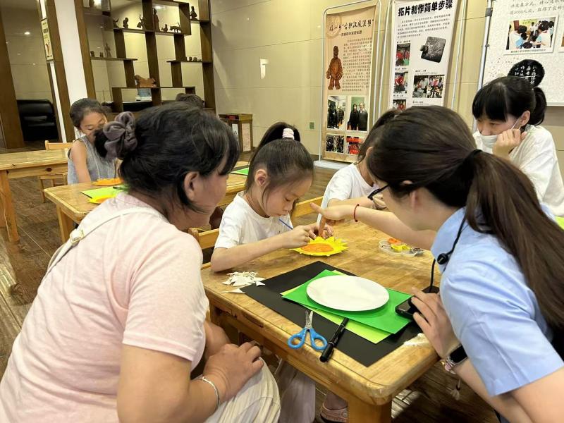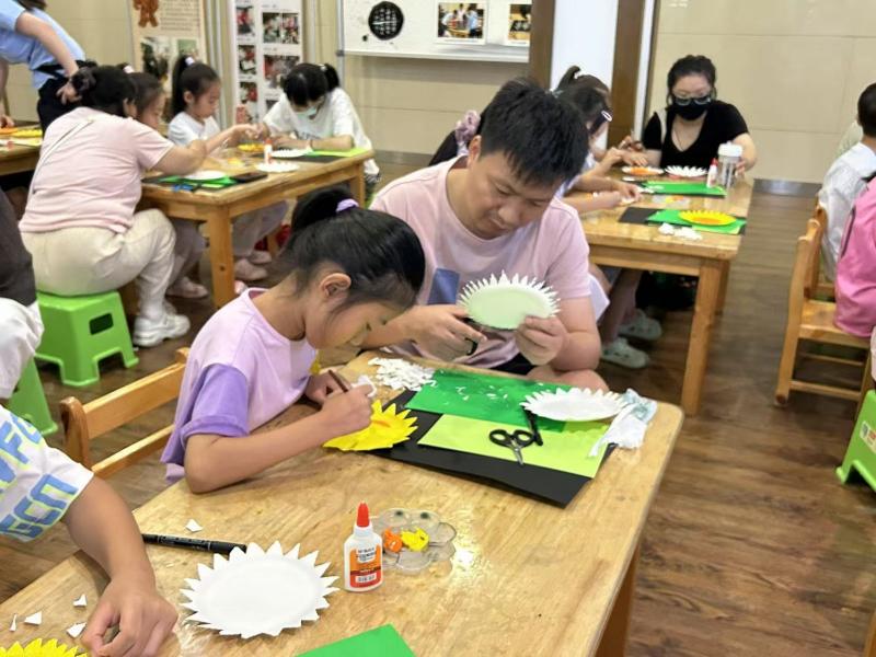 活动现场,孩子们首先通过生动有趣的讲解,了解了立秋节气的传统习俗和自然特征。随后,在社教老师的带领下,小朋友们发挥奇思妙想,用彩色卡纸、画笔等材料制作出独一无二的向日葵手工作品。有的孩子为向日葵添上了灿烂的笑脸,有的用剪纸做出翩翩起舞的蝴蝶,每一件作品都充满童趣与创意。家长们也积极参与其中,与孩子一起剪剪贴贴,现场洋溢着温馨欢乐的氛围。