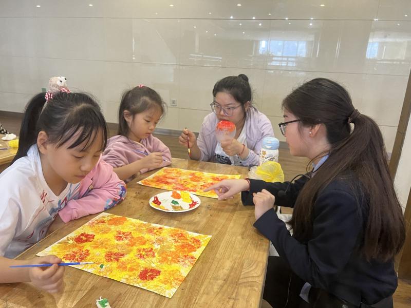 活动现场,孩子们首先在社教老师的讲解中,深入了解了秋分的气候特征以及“竖蛋”、“吃秋菜”等传统习俗,感知中华文化。随后,创作环节正式开启。孩子们以透明的保鲜膜为拓包,挥洒想象力,用画笔和颜料尽情描绘心中的秋天。趣味盎然的创作方式打破了传统美术的边界,一幅幅色彩斑斓、充满童趣的秋日图景在灵巧的小手中诞生。
